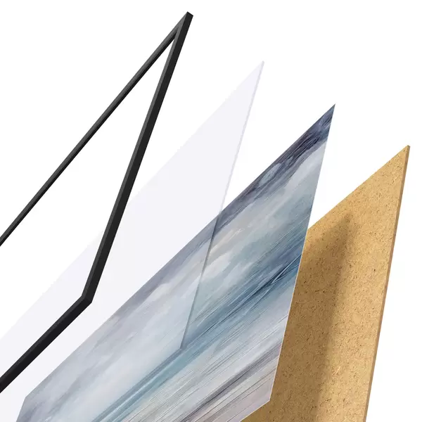 Das Poster besteht aus einem Rahmen, Plexiglas, einem gedruckten Bild und einer Rückwand aus Spanplatten. Dank der Halterungen auf der Rückseite kann das Poster sofort an die Wand gehängt werden.