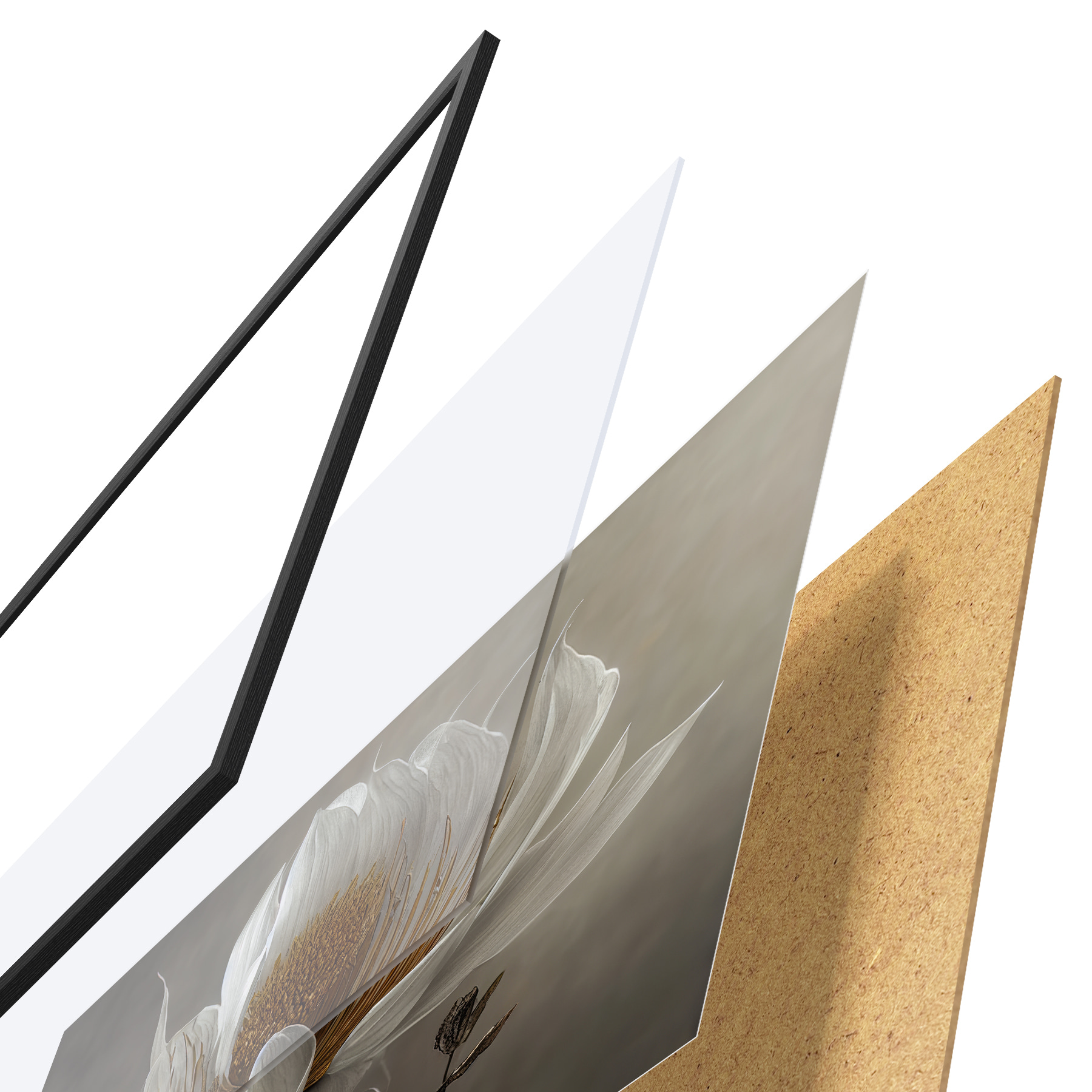 Das Poster besteht aus einem Rahmen, Plexiglas, einem gedruckten Bild und einer Rückwand aus Spanplatten. Dank der Halterungen auf der Rückseite kann das Poster sofort an die Wand gehängt werden.