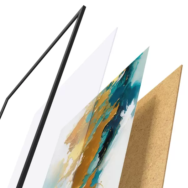 Das Poster besteht aus einem Rahmen, Plexiglas, einem gedruckten Bild und einer Rückwand aus Spanplatten. Dank der Halterungen auf der Rückseite kann das Poster sofort an die Wand gehängt werden.