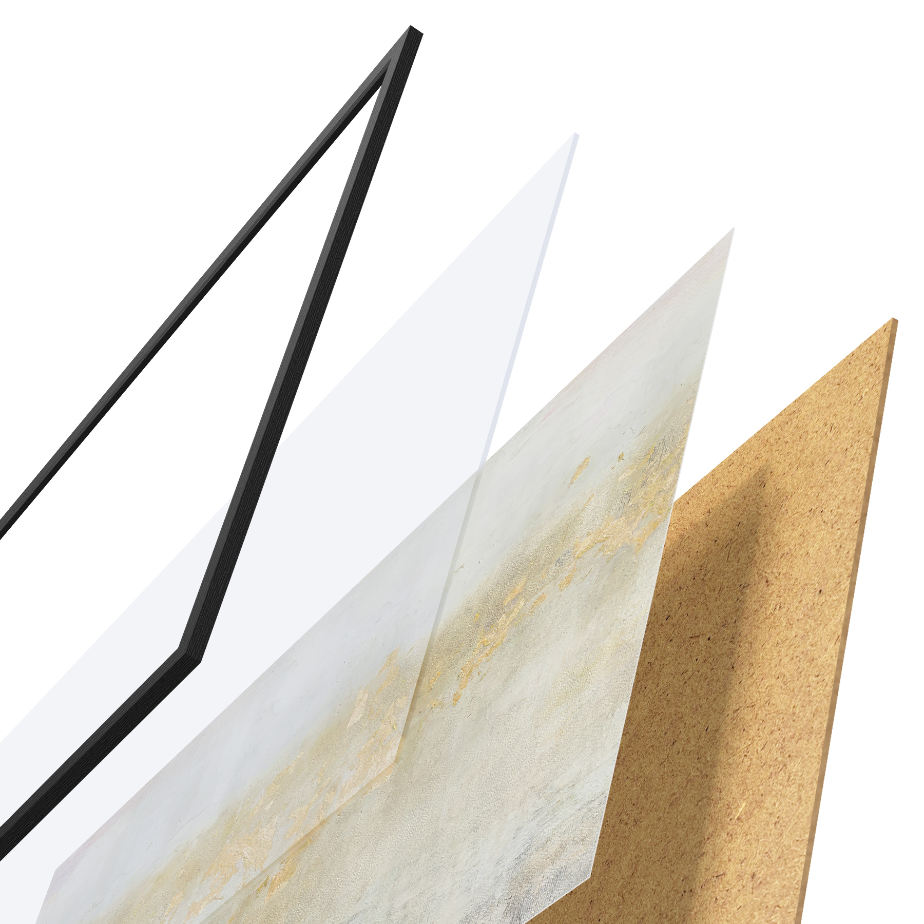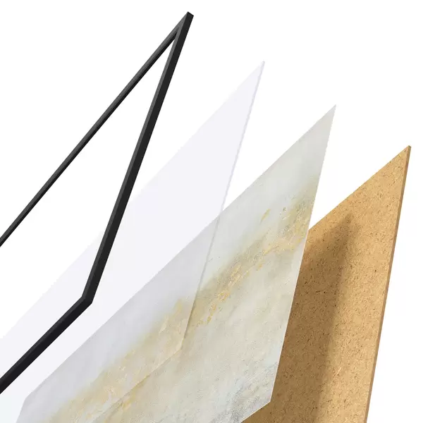 Das Poster besteht aus einem Rahmen, Plexiglas, einem gedruckten Bild und einer Rückwand aus Spanplatten. Dank der Halterungen auf der Rückseite kann das Poster sofort an die Wand gehängt werden.