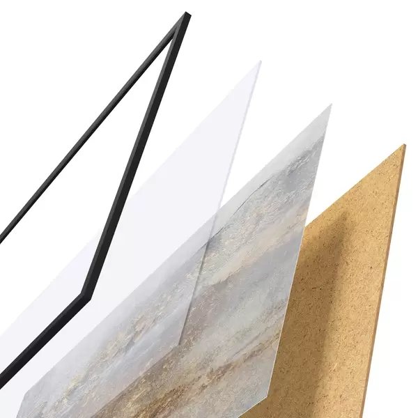 Das Poster besteht aus einem Rahmen, Plexiglas, einem gedruckten Bild und einer Rückwand aus Spanplatten. Dank der Halterungen auf der Rückseite kann das Poster sofort an die Wand gehängt werden.