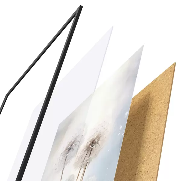 Das Poster besteht aus einem Rahmen, Plexiglas, einem gedruckten Bild und einer Rückwand aus Spanplatten. Dank der Halterungen auf der Rückseite kann das Poster sofort an die Wand gehängt werden.