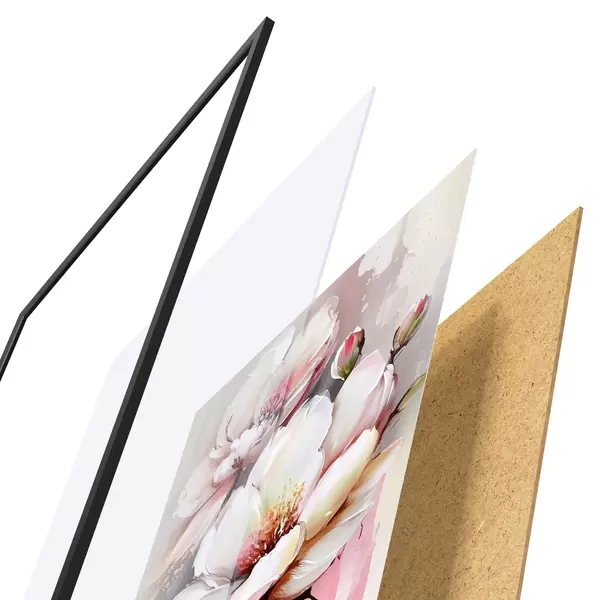 Das Poster besteht aus einem Rahmen, Plexiglas, einem gedruckten Bild und einer Rückwand aus Spanplatten. Dank der Halterungen auf der Rückseite kann das Poster sofort an die Wand gehängt werden.