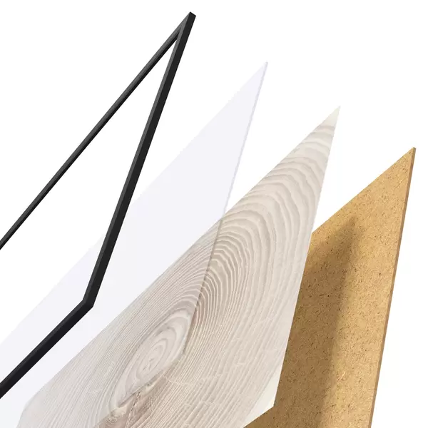 Das Poster besteht aus einem Rahmen, Plexiglas, einem gedruckten Bild und einer Rückwand aus Spanplatten. Dank der Halterungen auf der Rückseite kann das Poster sofort an die Wand gehängt werden.