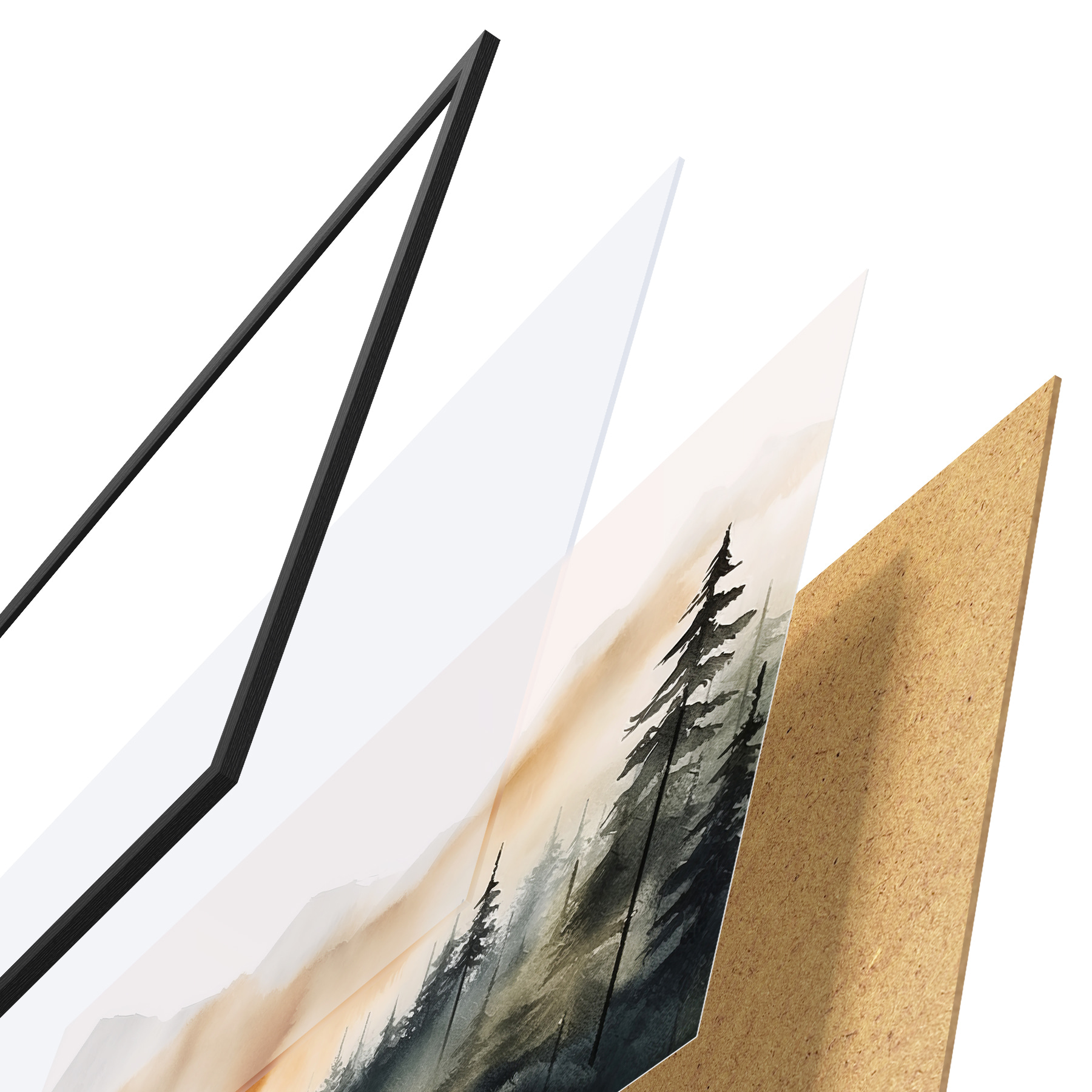 Das Poster besteht aus einem Rahmen, Plexiglas, einem gedruckten Bild und einer Rückwand aus Spanplatten. Dank der Halterungen auf der Rückseite kann das Poster sofort an die Wand gehängt werden.
