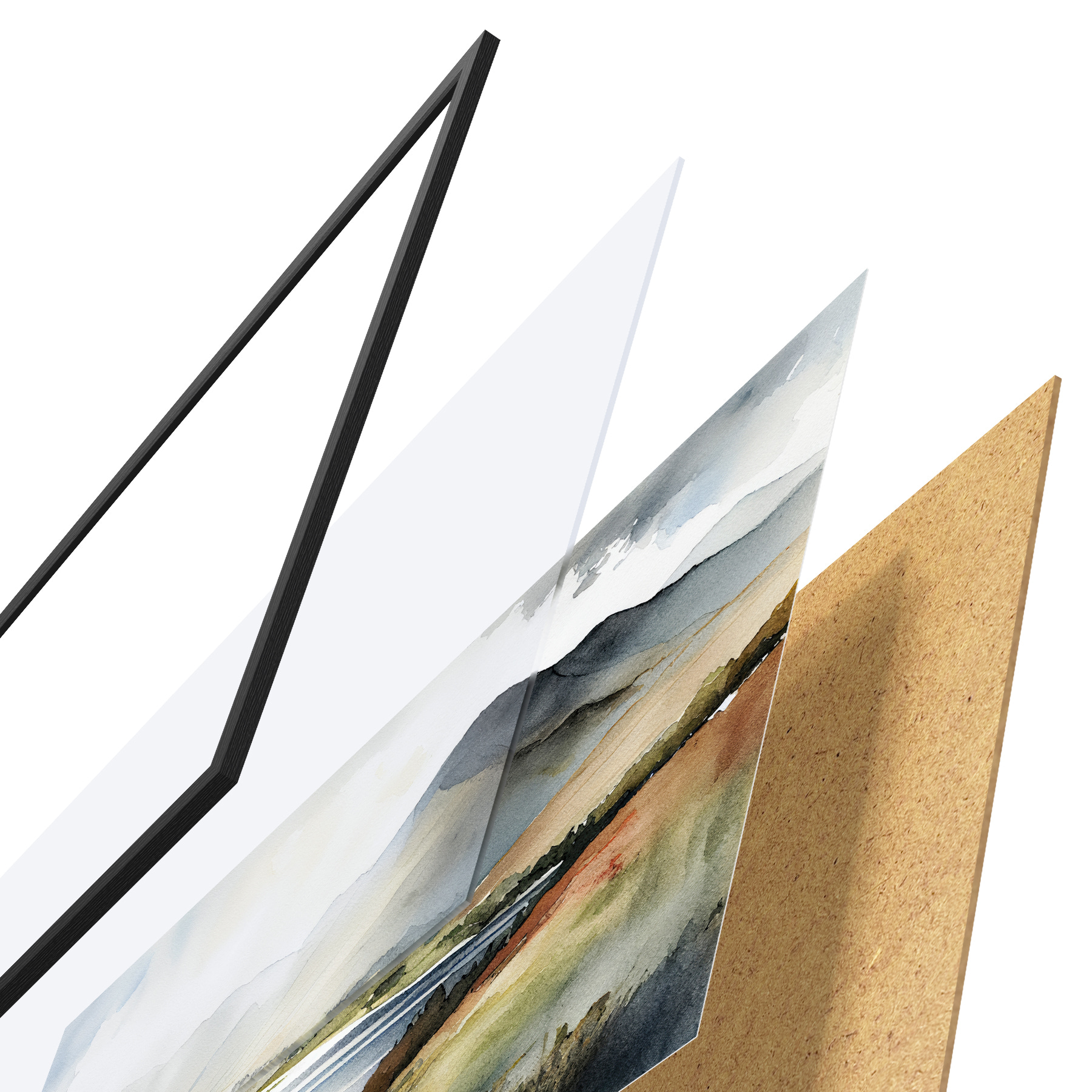 Das Poster besteht aus einem Rahmen, Plexiglas, einem gedruckten Bild und einer Rückwand aus Spanplatten. Dank der Halterungen auf der Rückseite kann das Poster sofort an die Wand gehängt werden.