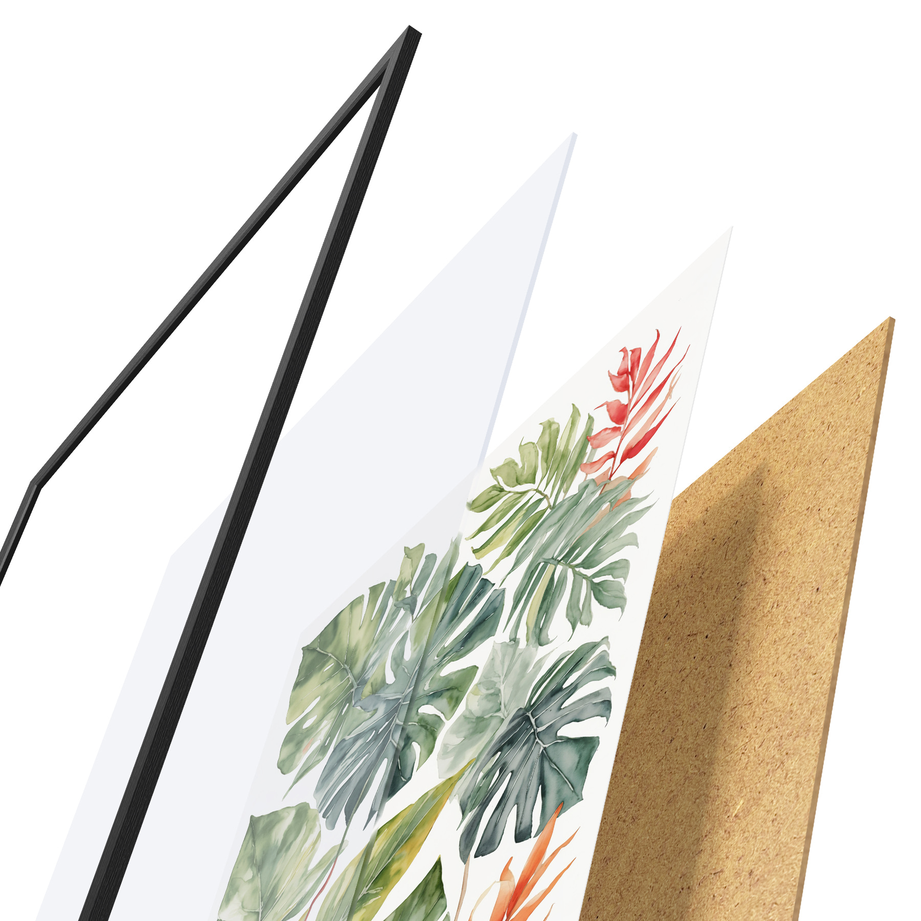 Das Poster besteht aus einem Rahmen, Plexiglas, einem gedruckten Bild und einer Rückwand aus Spanplatten. Dank der Halterungen auf der Rückseite kann das Poster sofort an die Wand gehängt werden.