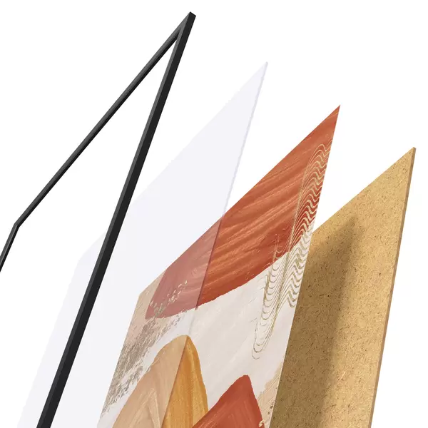 Das Poster besteht aus einem Rahmen, Plexiglas, einem gedruckten Bild und einer Rückwand aus Spanplatten. Dank der Halterungen auf der Rückseite kann das Poster sofort an die Wand gehängt werden.