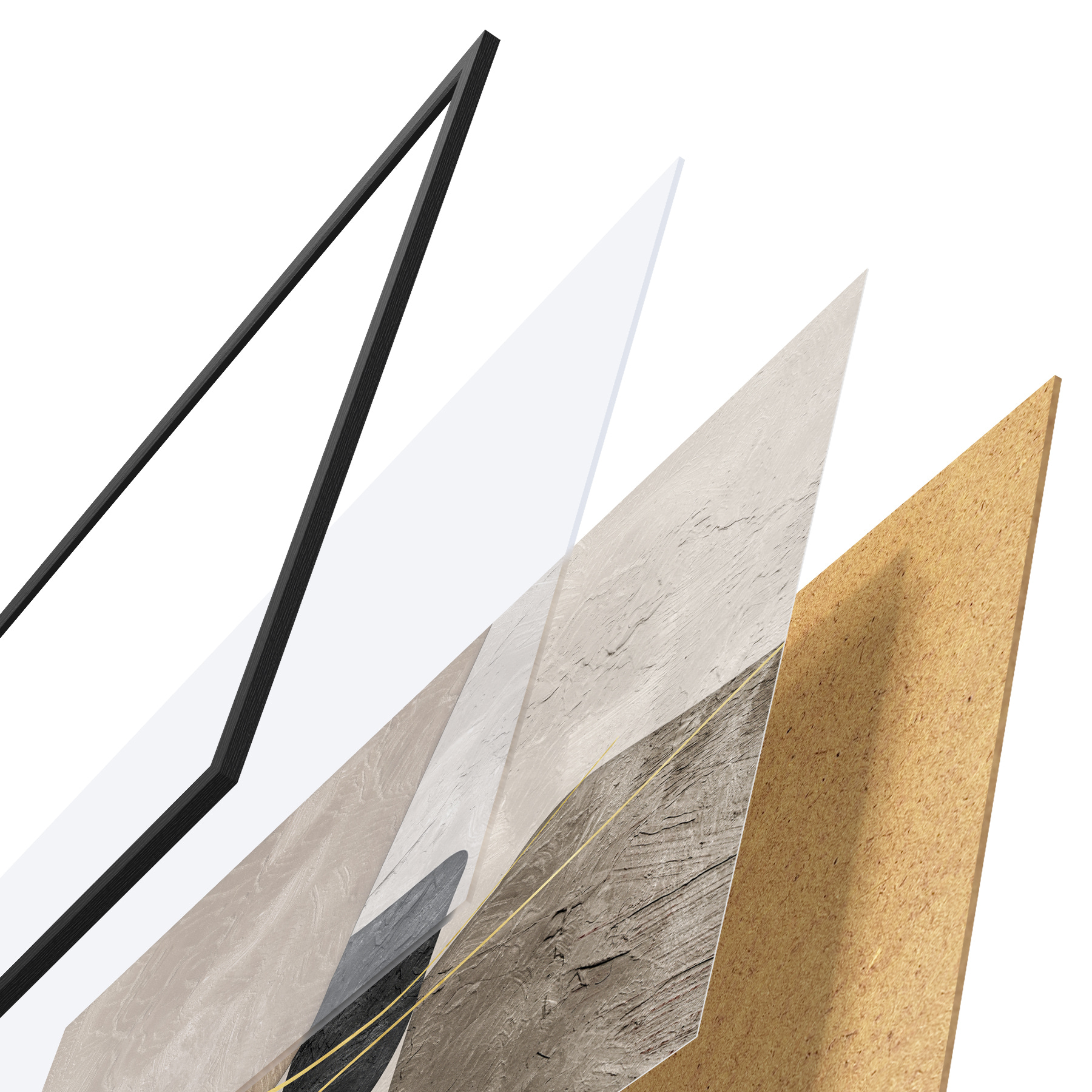 Das Poster besteht aus einem Rahmen, Plexiglas, einem gedruckten Bild und einer Rückwand aus Spanplatten. Dank der Halterungen auf der Rückseite kann das Poster sofort an die Wand gehängt werden.