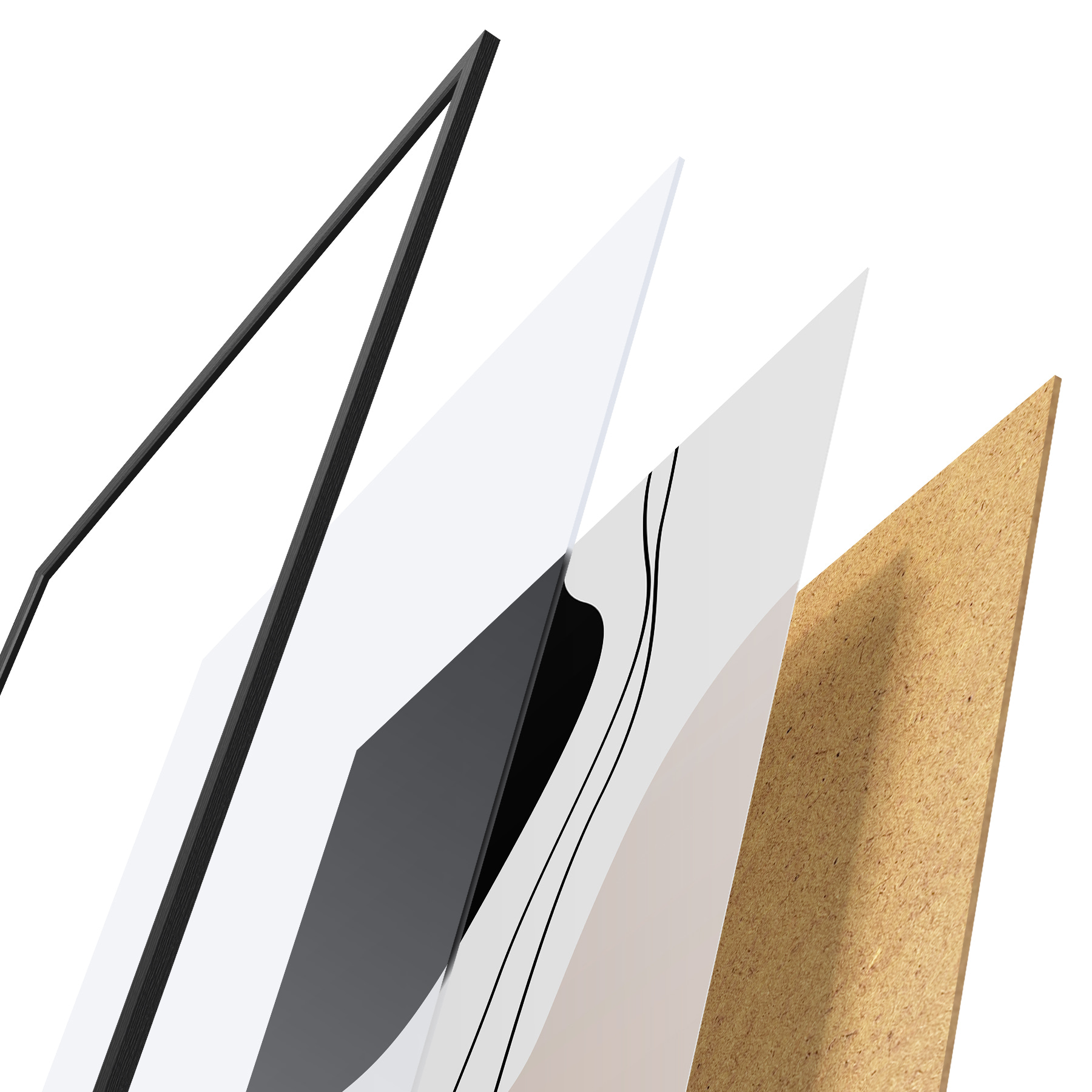 Das Poster besteht aus einem Rahmen, Plexiglas, einem gedruckten Bild und einer Rückwand aus Spanplatten. Dank der Halterungen auf der Rückseite kann das Poster sofort an die Wand gehängt werden.