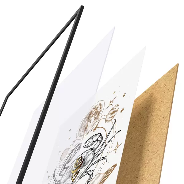 Das Poster besteht aus einem Rahmen, Plexiglas, einem gedruckten Bild und einer Rückwand aus Spanplatten. Dank der Halterungen auf der Rückseite kann das Poster sofort an die Wand gehängt werden.