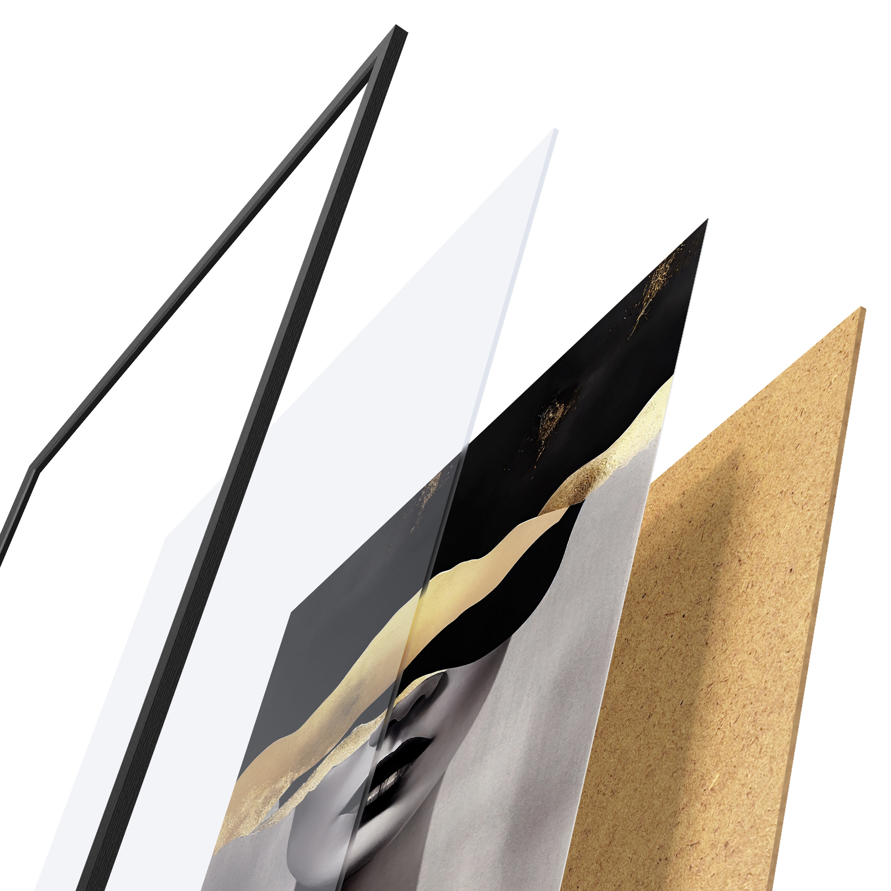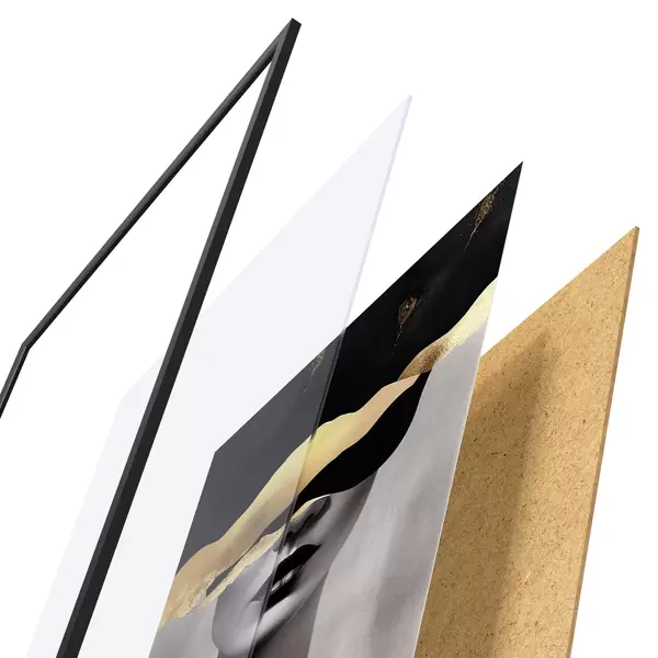 Das Poster besteht aus einem Rahmen, Plexiglas, einem gedruckten Bild und einer Rückwand aus Spanplatten. Dank der Halterungen auf der Rückseite kann das Poster sofort an die Wand gehängt werden.