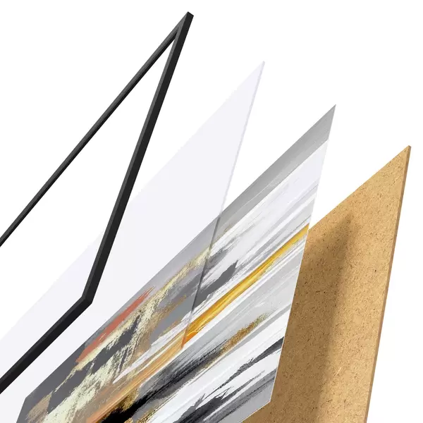 Das Poster besteht aus einem Rahmen, Plexiglas, einem gedruckten Bild und einer Rückwand aus Spanplatten. Dank der Halterungen auf der Rückseite kann das Poster sofort an die Wand gehängt werden.