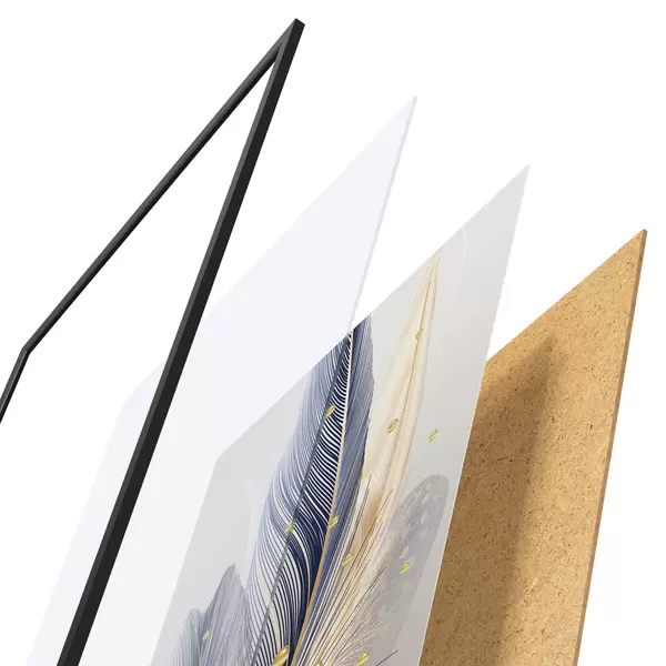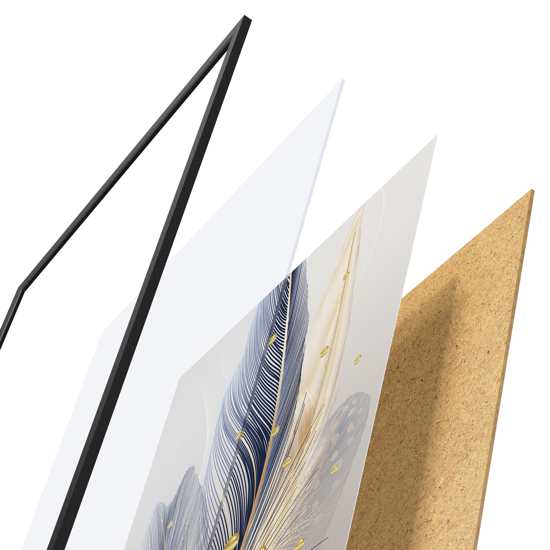 Das Poster besteht aus einem Rahmen, Plexiglas, einem gedruckten Bild und einer Rückwand aus Spanplatten. Dank der Halterungen auf der Rückseite kann das Poster sofort an die Wand gehängt werden.