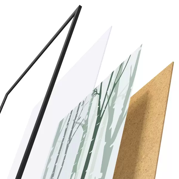 Das Poster besteht aus einem Rahmen, Plexiglas, einem gedruckten Bild und einer Rückwand aus Spanplatten. Dank der Halterungen auf der Rückseite kann das Poster sofort an die Wand gehängt werden.