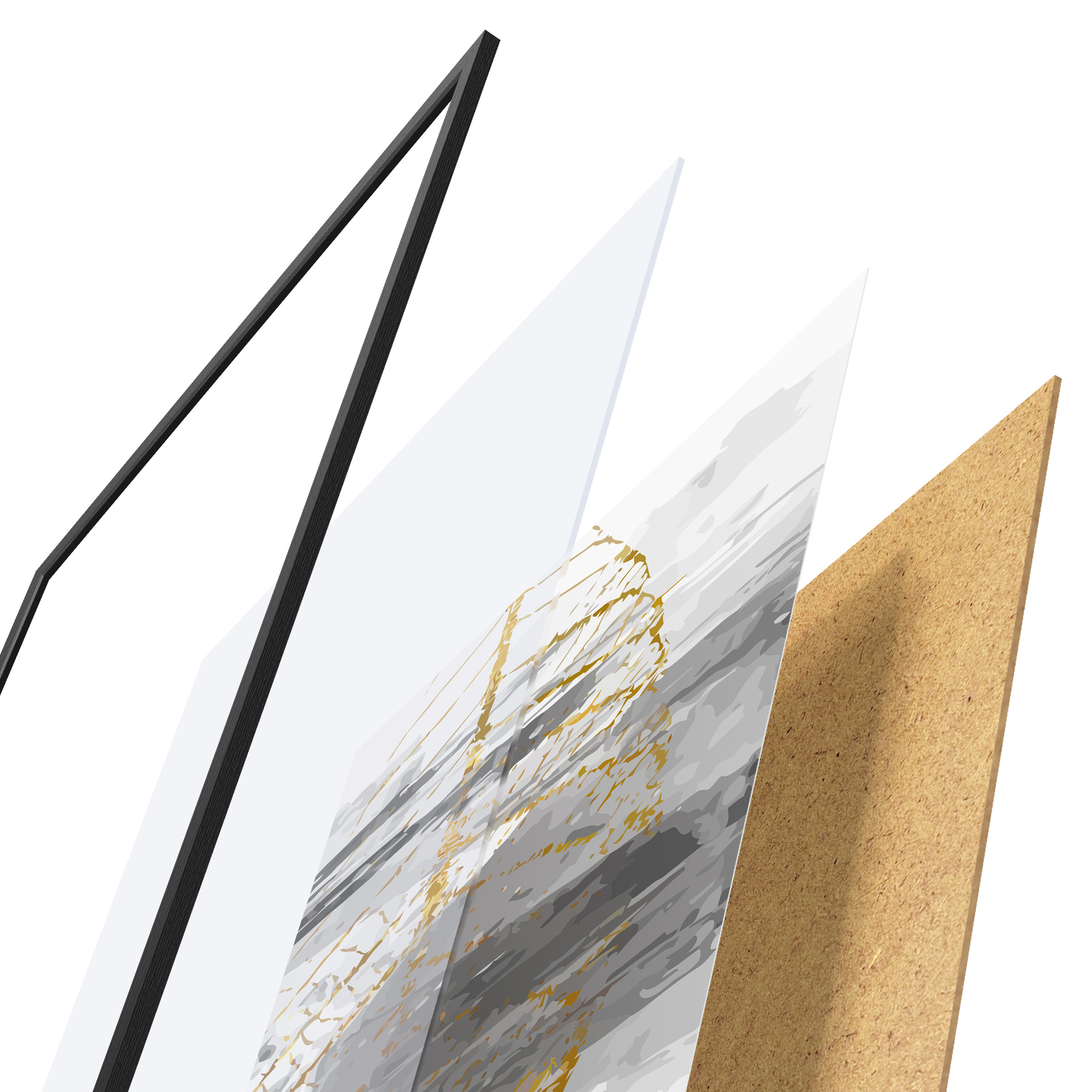 Das Poster besteht aus einem Rahmen, Plexiglas, einem gedruckten Bild und einer Rückwand aus Spanplatten. Dank der Halterungen auf der Rückseite kann das Poster sofort an die Wand gehängt werden.