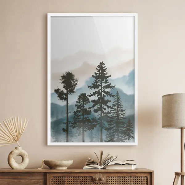 Poster Nebelverhangene Waldsilhouette im Morgengrauen f36605