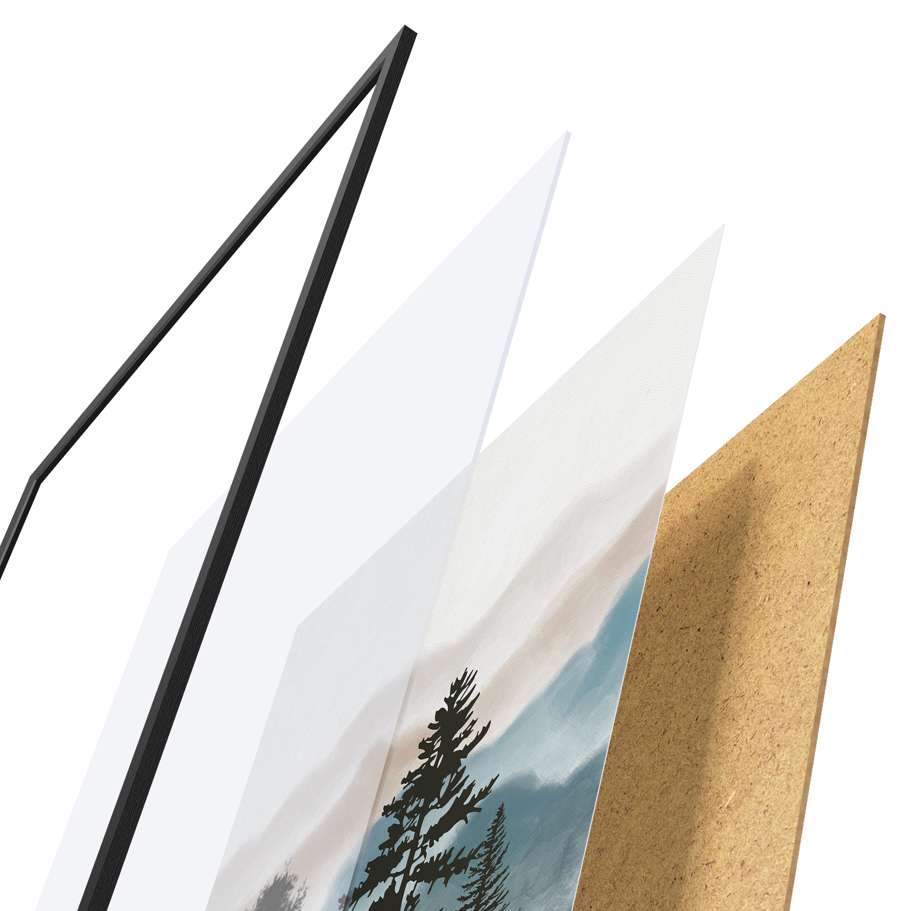 Das Poster besteht aus einem Rahmen, Plexiglas, einem gedruckten Bild und einer Rückwand aus Spanplatten. Dank der Halterungen auf der Rückseite kann das Poster sofort an die Wand gehängt werden.
