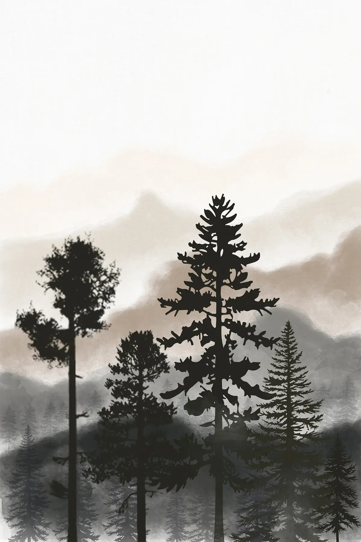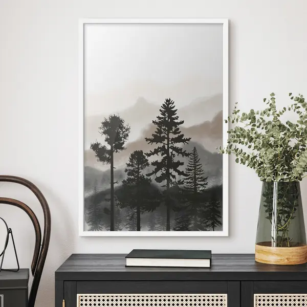 Poster Nebelverhangene Berge und dunkle Silhouetten f36605v1