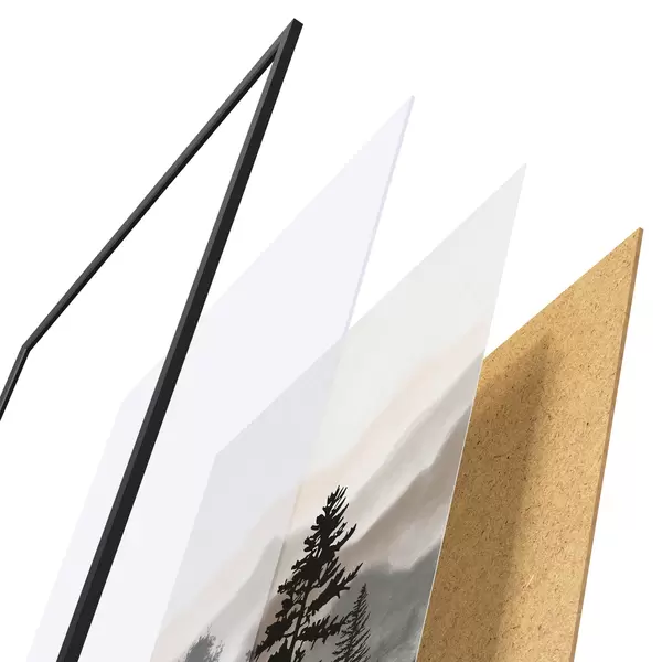 Das Poster besteht aus einem Rahmen, Plexiglas, einem gedruckten Bild und einer Rückwand aus Spanplatten. Dank der Halterungen auf der Rückseite kann das Poster sofort an die Wand gehängt werden.