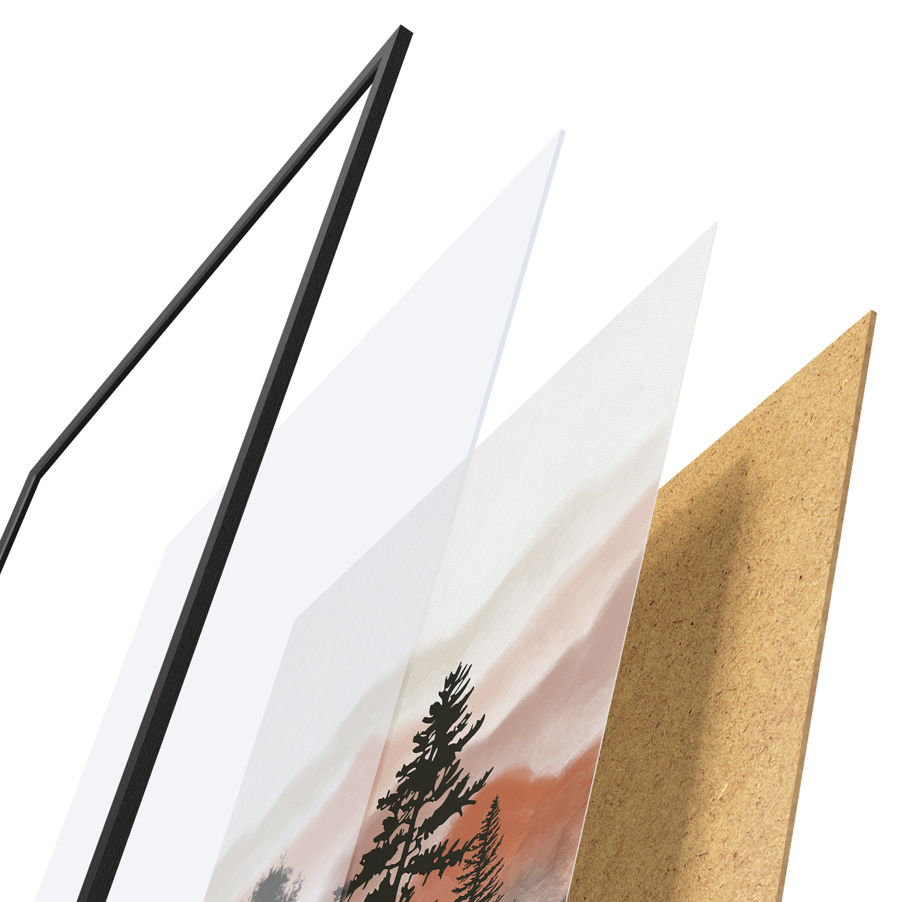 Das Poster besteht aus einem Rahmen, Plexiglas, einem gedruckten Bild und einer Rückwand aus Spanplatten. Dank der Halterungen auf der Rückseite kann das Poster sofort an die Wand gehängt werden.