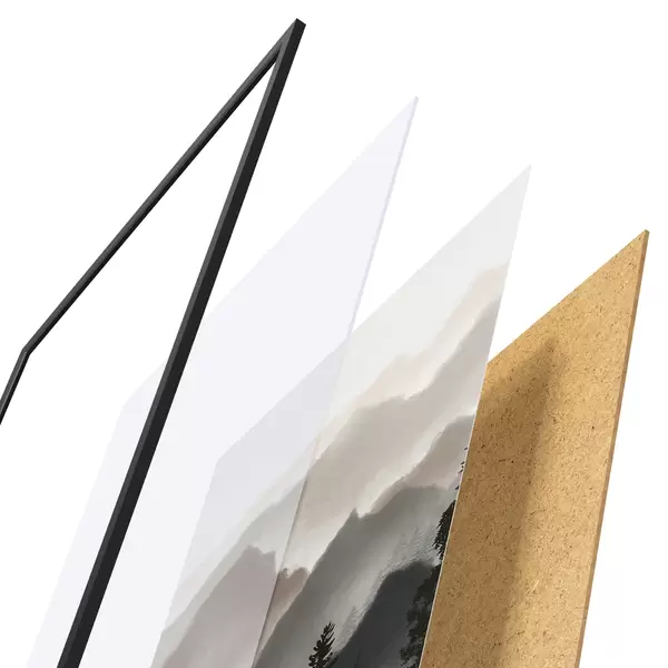 Das Poster besteht aus einem Rahmen, Plexiglas, einem gedruckten Bild und einer Rückwand aus Spanplatten. Dank der Halterungen auf der Rückseite kann das Poster sofort an die Wand gehängt werden.