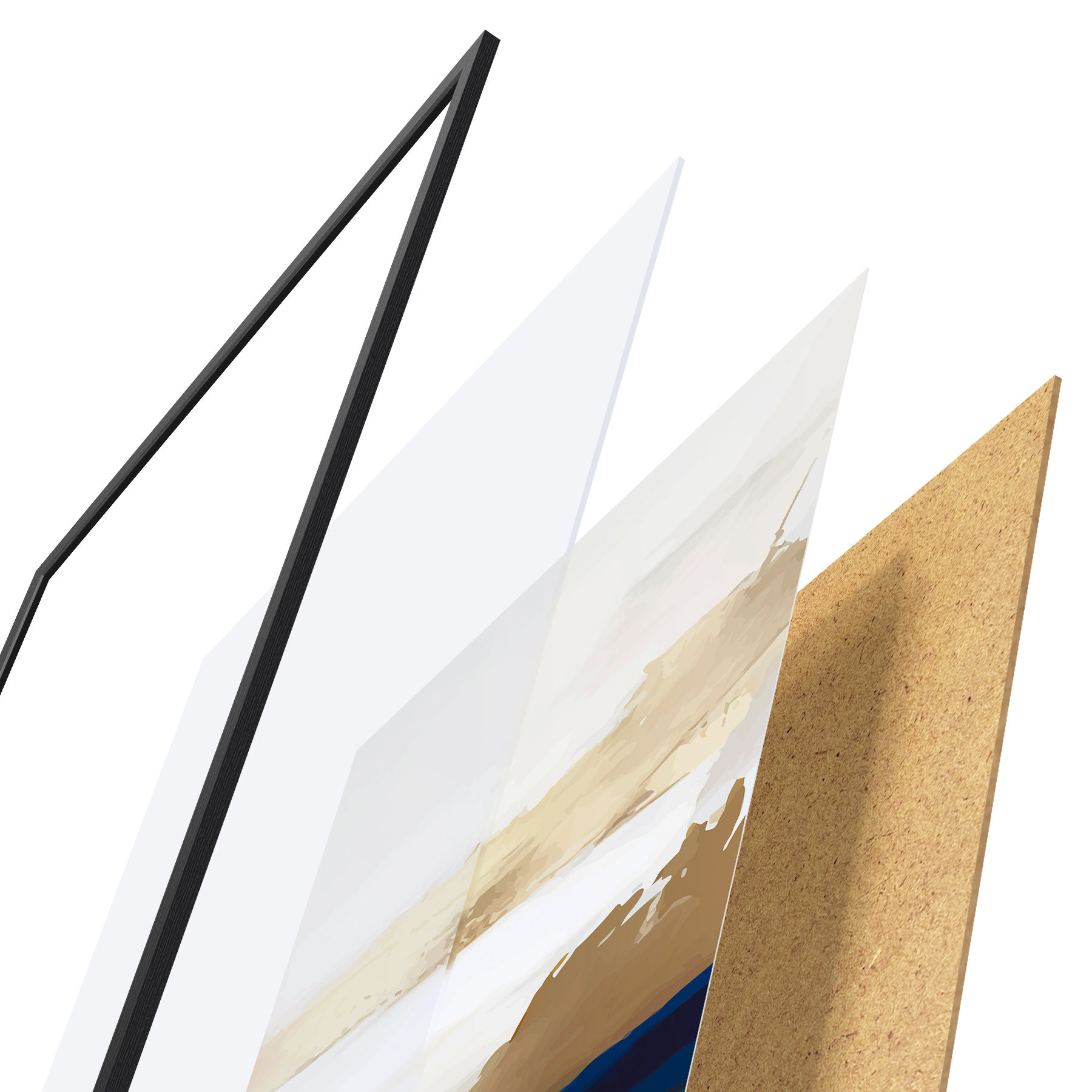 Das Poster besteht aus einem Rahmen, Plexiglas, einem gedruckten Bild und einer Rückwand aus Spanplatten. Dank der Halterungen auf der Rückseite kann das Poster sofort an die Wand gehängt werden.