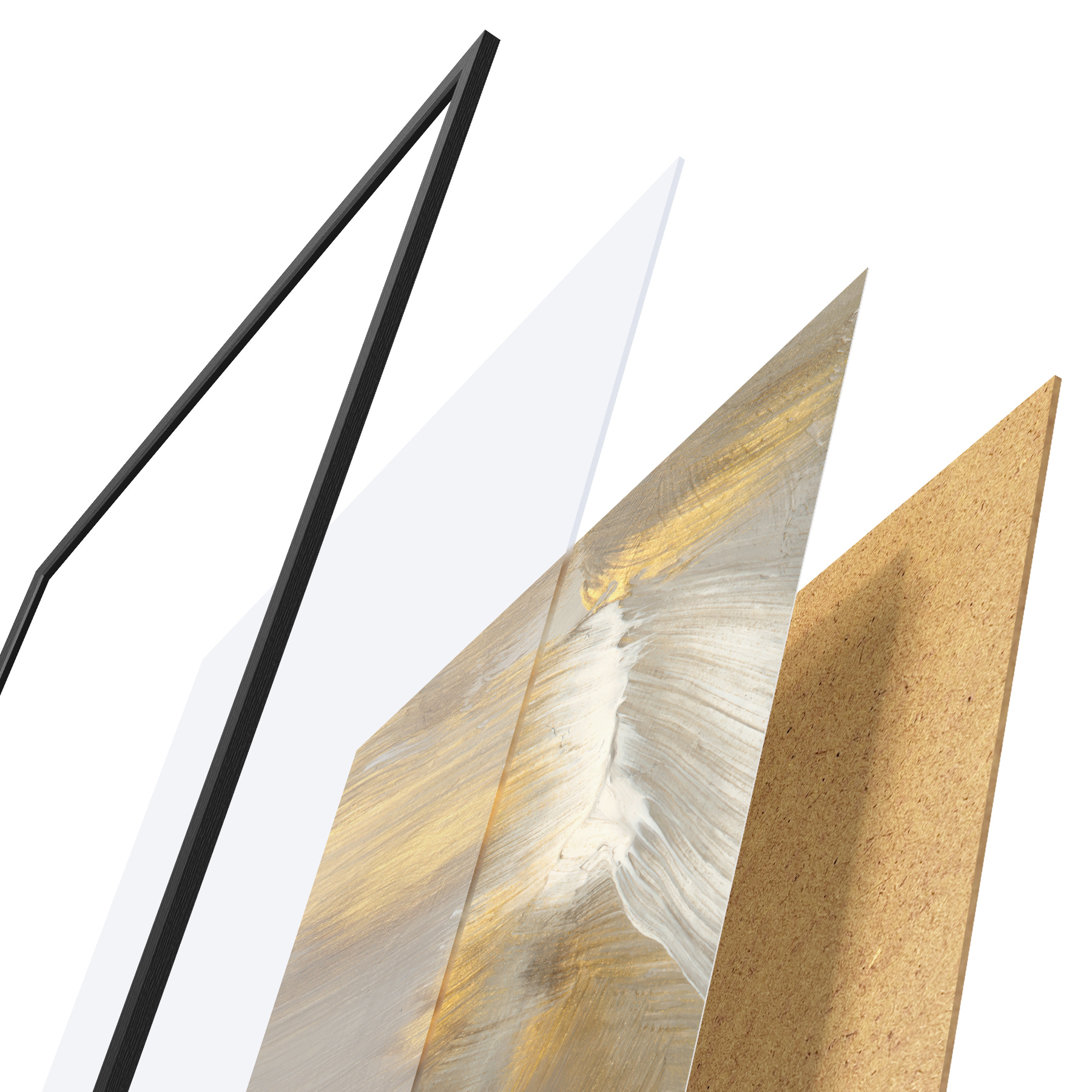 Das Poster besteht aus einem Rahmen, Plexiglas, einem gedruckten Bild und einer Rückwand aus Spanplatten. Dank der Halterungen auf der Rückseite kann das Poster sofort an die Wand gehängt werden.