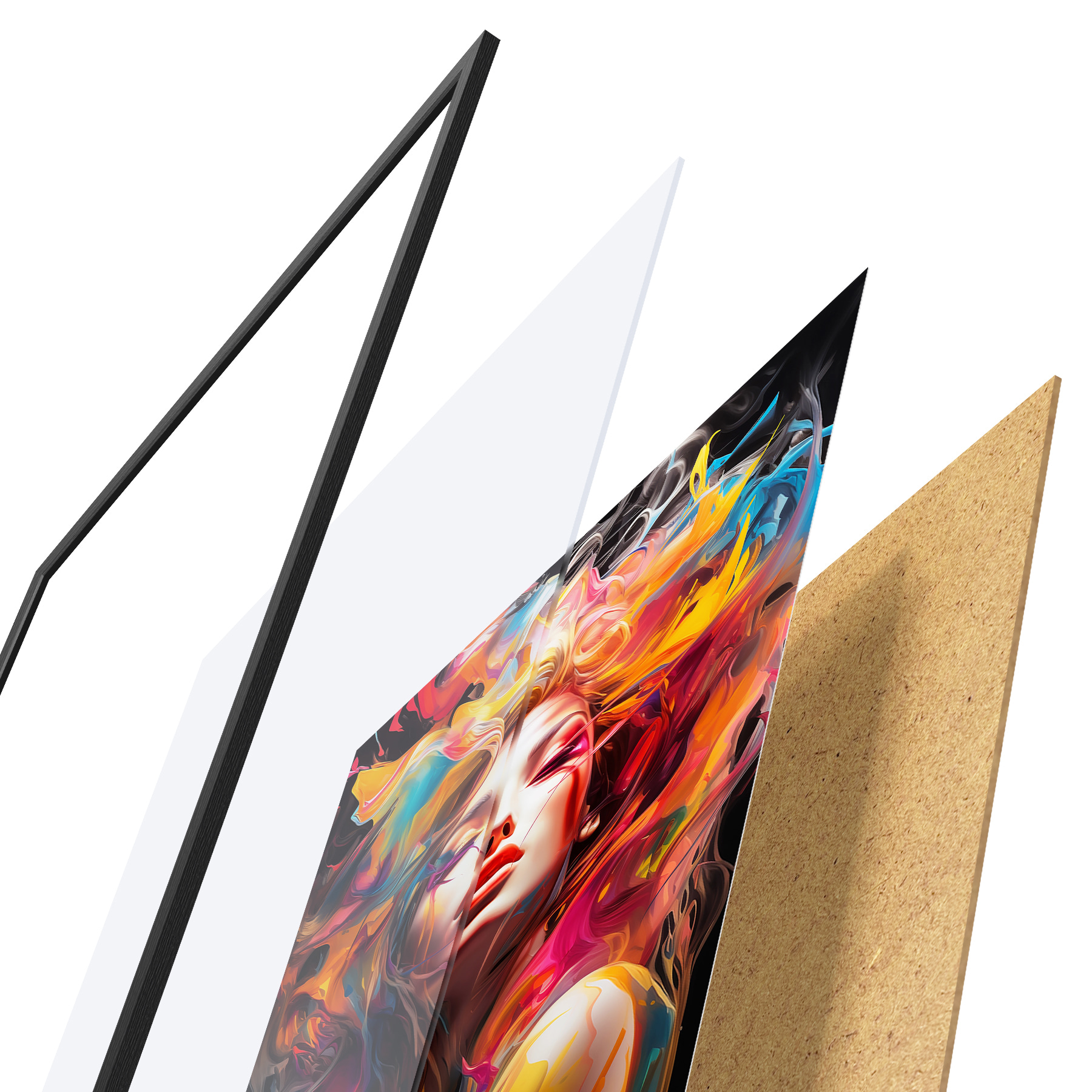 Das Poster besteht aus einem Rahmen, Plexiglas, einem gedruckten Bild und einer Rückwand aus Spanplatten. Dank der Halterungen auf der Rückseite kann das Poster sofort an die Wand gehängt werden.