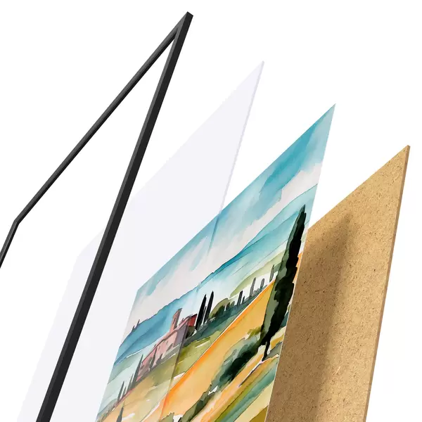 Das Poster besteht aus einem Rahmen, Plexiglas, einem gedruckten Bild und einer Rückwand aus Spanplatten. Dank der Halterungen auf der Rückseite kann das Poster sofort an die Wand gehängt werden.