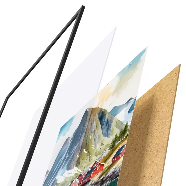 Das Poster besteht aus einem Rahmen, Plexiglas, einem gedruckten Bild und einer Rückwand aus Spanplatten. Dank der Halterungen auf der Rückseite kann das Poster sofort an die Wand gehängt werden.