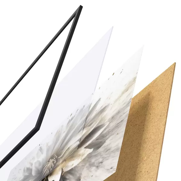Das Poster besteht aus einem Rahmen, Plexiglas, einem gedruckten Bild und einer Rückwand aus Spanplatten. Dank der Halterungen auf der Rückseite kann das Poster sofort an die Wand gehängt werden.