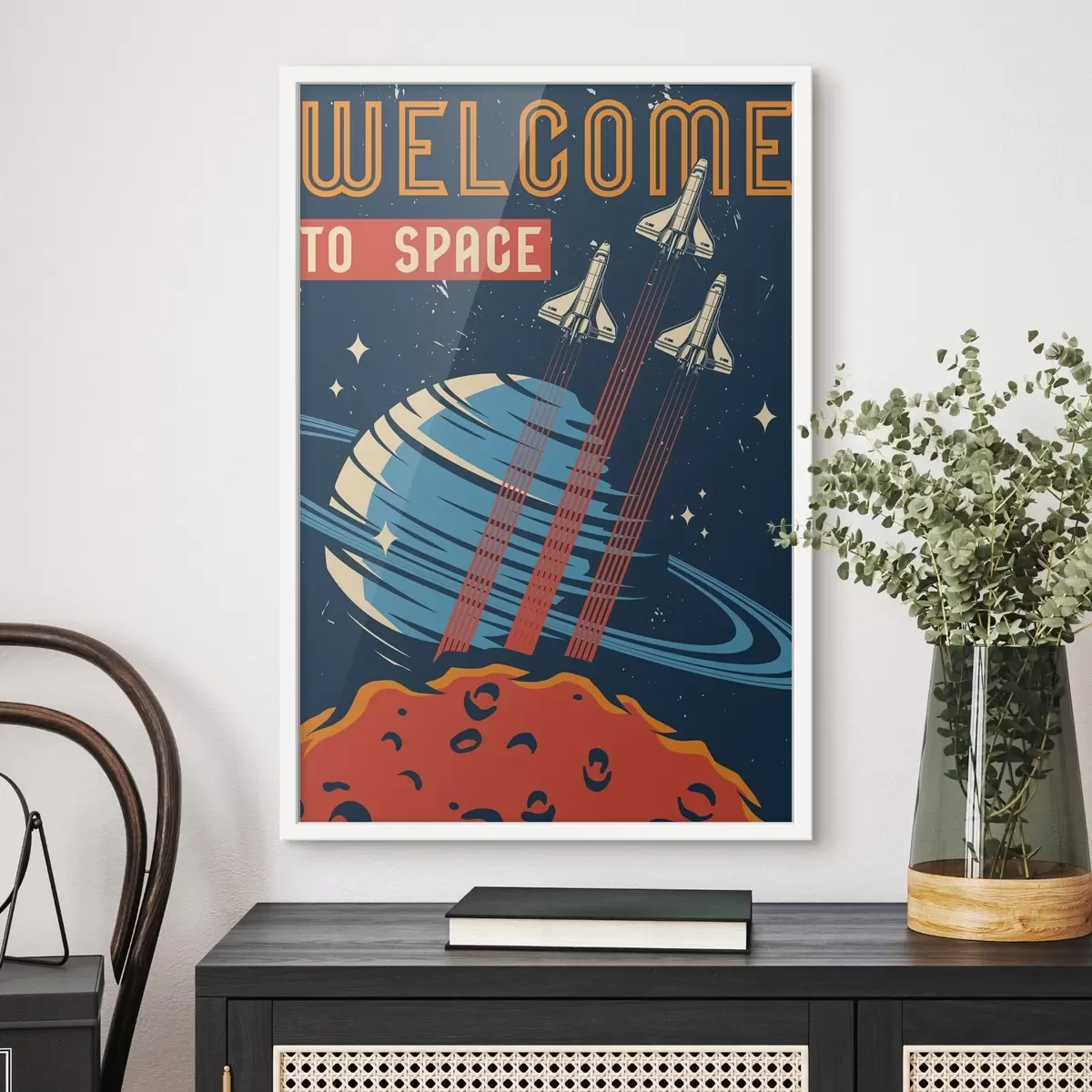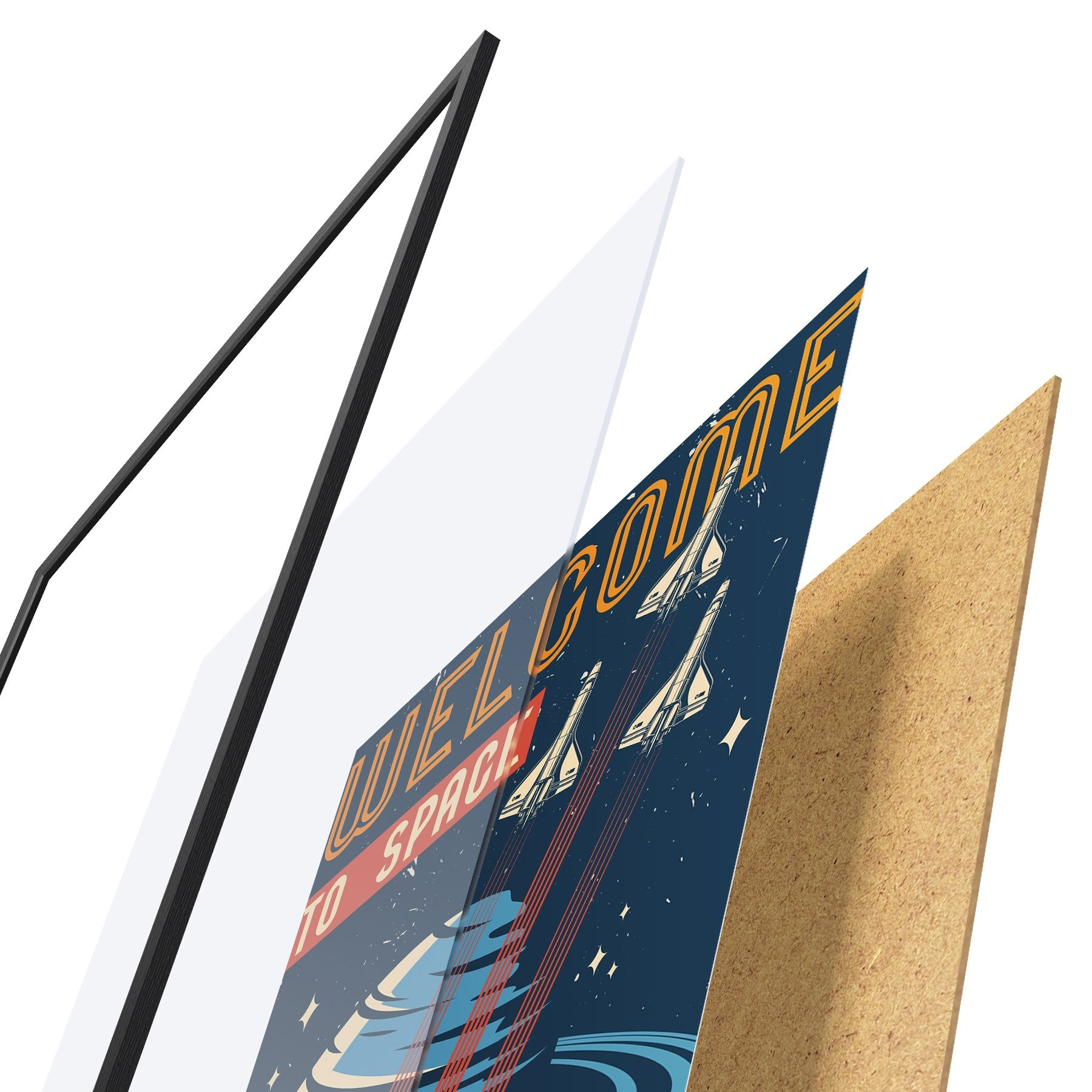Das Poster besteht aus einem Rahmen, Plexiglas, einem gedruckten Bild und einer Rückwand aus Spanplatten. Dank der Halterungen auf der Rückseite kann das Poster sofort an die Wand gehängt werden.