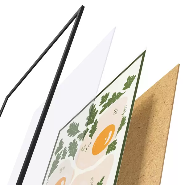 Das Poster besteht aus einem Rahmen, Plexiglas, einem gedruckten Bild und einer Rückwand aus Spanplatten. Dank der Halterungen auf der Rückseite kann das Poster sofort an die Wand gehängt werden.