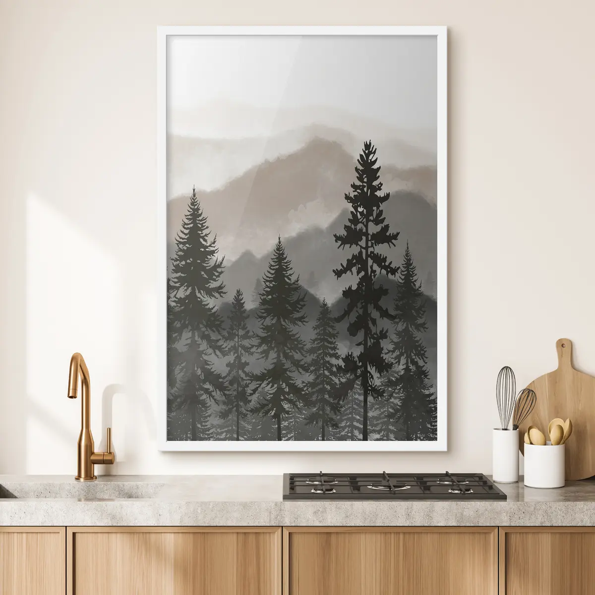 Poster Nebelverhangene Berge mit hoch aufragenden Bäumen Nr f37017v1