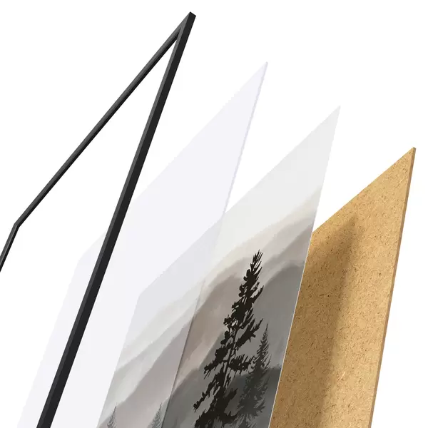 Das Poster besteht aus einem Rahmen, Plexiglas, einem gedruckten Bild und einer Rückwand aus Spanplatten. Dank der Halterungen auf der Rückseite kann das Poster sofort an die Wand gehängt werden.