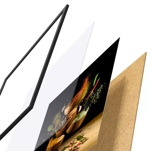 Das Poster besteht aus einem Rahmen, Plexiglas, einem gedruckten Bild und einer Rückwand aus Spanplatten. Dank der Halterungen auf der Rückseite kann das Poster sofort an die Wand gehängt werden.