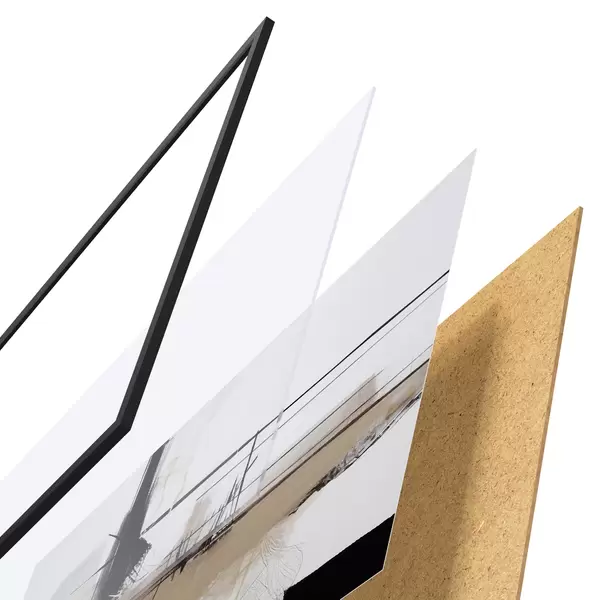Das Poster besteht aus einem Rahmen, Plexiglas, einem gedruckten Bild und einer Rückwand aus Spanplatten. Dank der Halterungen auf der Rückseite kann das Poster sofort an die Wand gehängt werden.