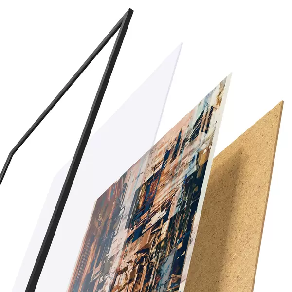 Das Poster besteht aus einem Rahmen, Plexiglas, einem gedruckten Bild und einer Rückwand aus Spanplatten. Dank der Halterungen auf der Rückseite kann das Poster sofort an die Wand gehängt werden.