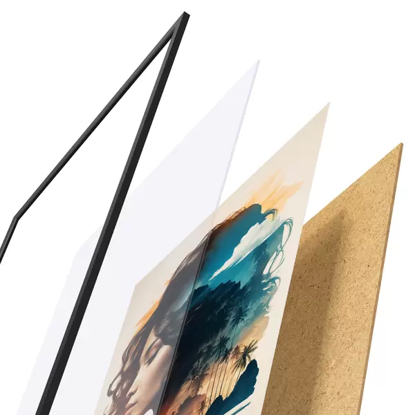 Das Poster besteht aus einem Rahmen, Plexiglas, einem gedruckten Bild und einer Rückwand aus Spanplatten. Dank der Halterungen auf der Rückseite kann das Poster sofort an die Wand gehängt werden.