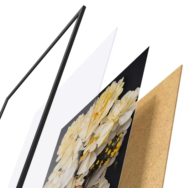 Das Poster besteht aus einem Rahmen, Plexiglas, einem gedruckten Bild und einer Rückwand aus Spanplatten. Dank der Halterungen auf der Rückseite kann das Poster sofort an die Wand gehängt werden.