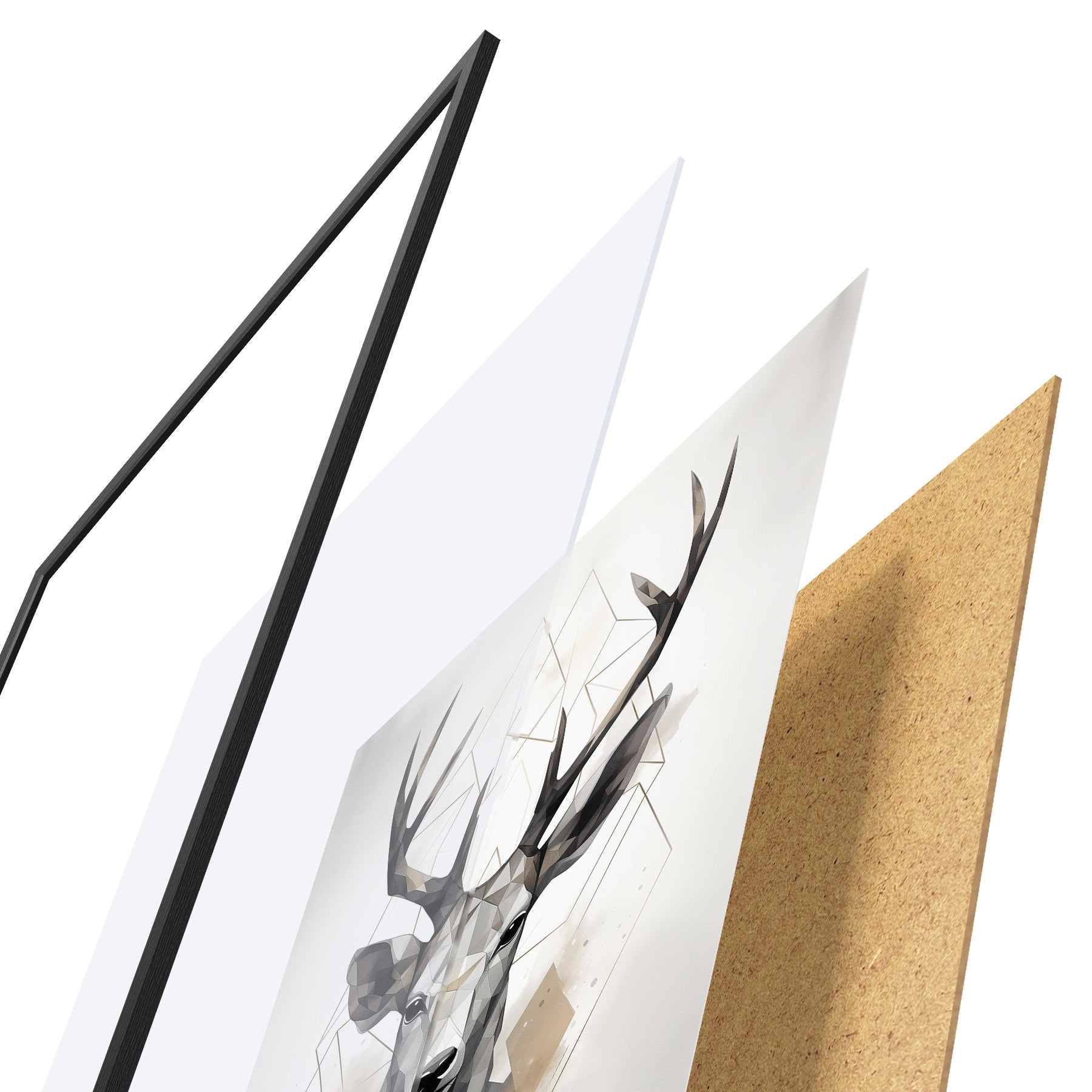Das Poster besteht aus einem Rahmen, Plexiglas, einem gedruckten Bild und einer Rückwand aus Spanplatten. Dank der Halterungen auf der Rückseite kann das Poster sofort an die Wand gehängt werden.