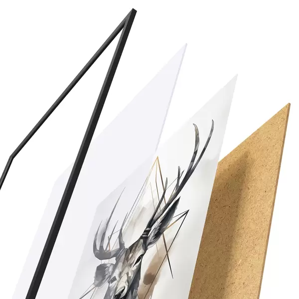 Das Poster besteht aus einem Rahmen, Plexiglas, einem gedruckten Bild und einer Rückwand aus Spanplatten. Dank der Halterungen auf der Rückseite kann das Poster sofort an die Wand gehängt werden.