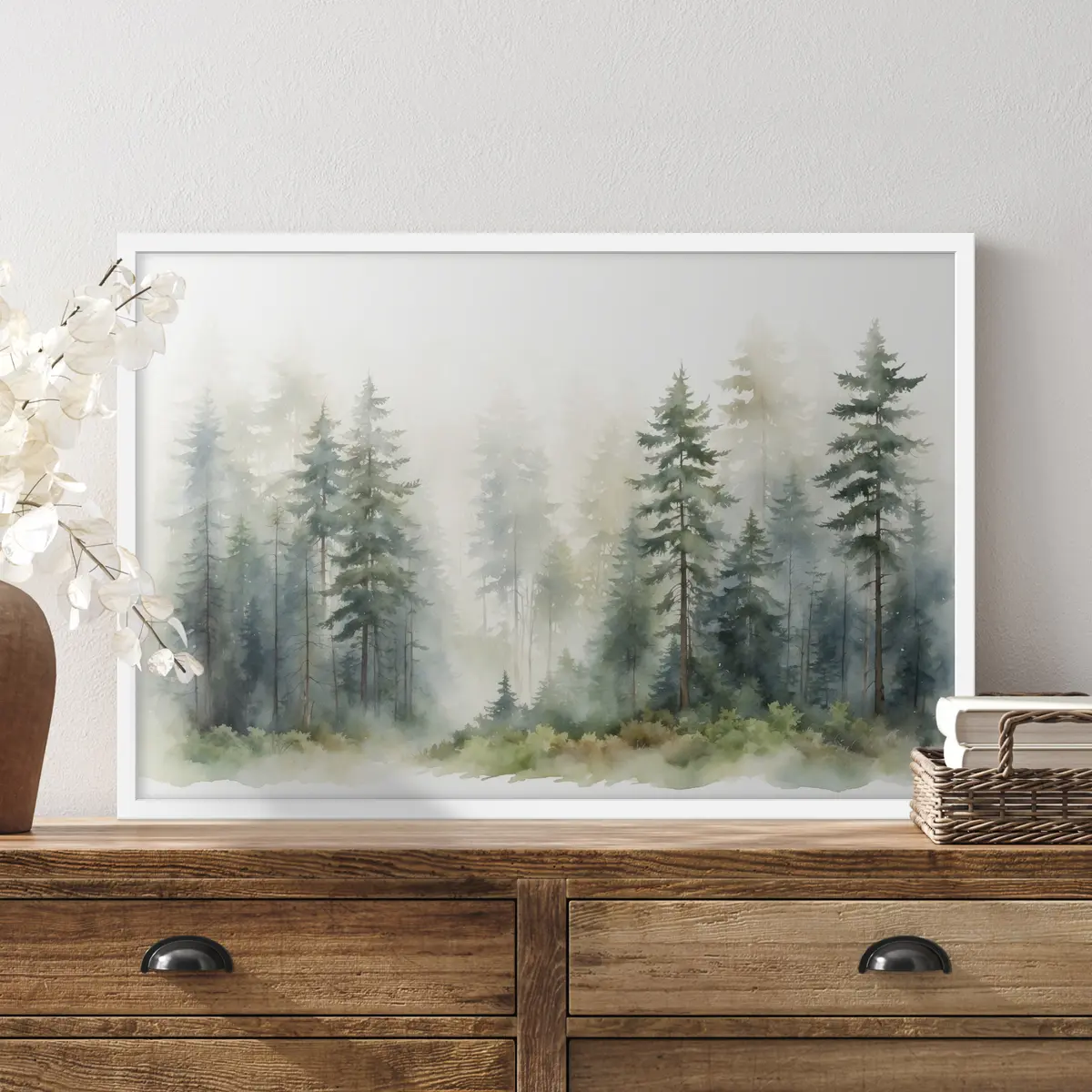 Poster Nebelverhangene Waldlandschaft in sanften Farbtönen Nr f37337