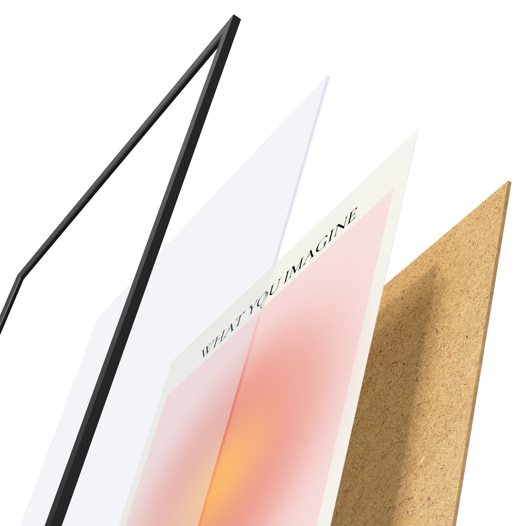 Das Poster besteht aus einem Rahmen, Plexiglas, einem gedruckten Bild und einer Rückwand aus Spanplatten. Dank der Halterungen auf der Rückseite kann das Poster sofort an die Wand gehängt werden.