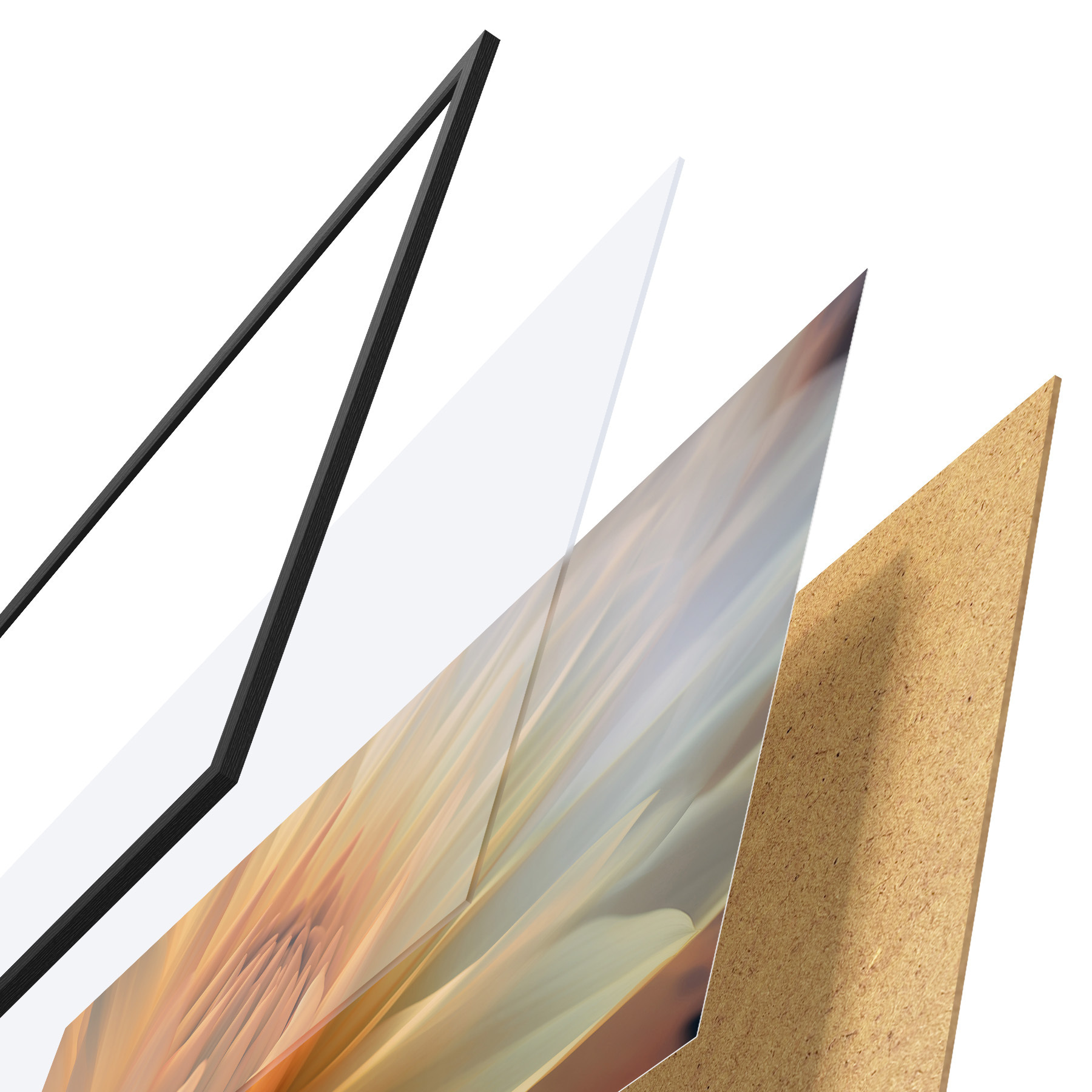 Das Poster besteht aus einem Rahmen, Plexiglas, einem gedruckten Bild und einer Rückwand aus Spanplatten. Dank der Halterungen auf der Rückseite kann das Poster sofort an die Wand gehängt werden.