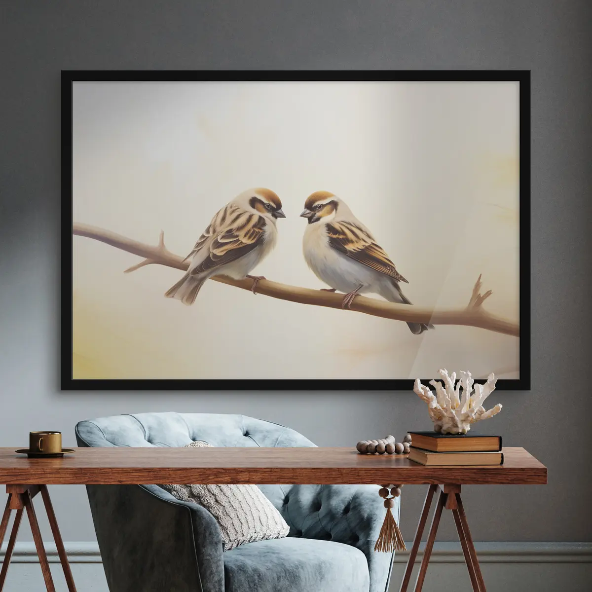 Poster Zwei Spatzen zusammen auf einem Ast f37393