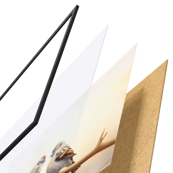 Das Poster besteht aus einem Rahmen, Plexiglas, einem gedruckten Bild und einer Rückwand aus Spanplatten. Dank der Halterungen auf der Rückseite kann das Poster sofort an die Wand gehängt werden.