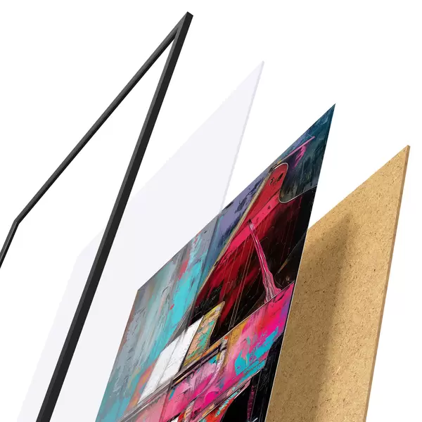 Das Poster besteht aus einem Rahmen, Plexiglas, einem gedruckten Bild und einer Rückwand aus Spanplatten. Dank der Halterungen auf der Rückseite kann das Poster sofort an die Wand gehängt werden.