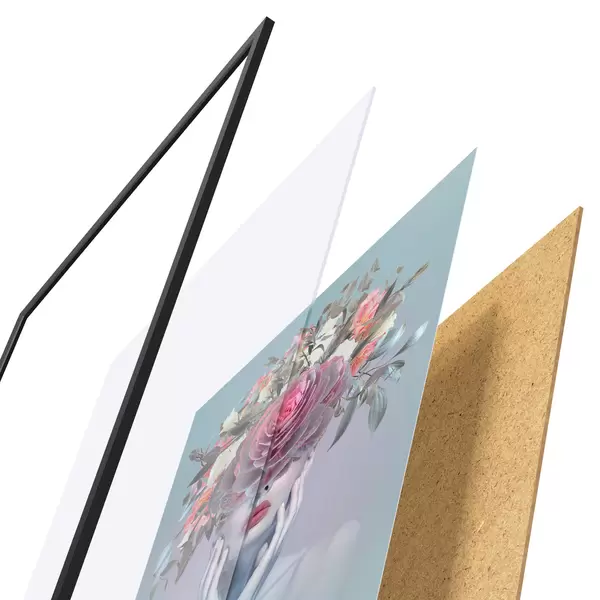 Das Poster besteht aus einem Rahmen, Plexiglas, einem gedruckten Bild und einer Rückwand aus Spanplatten. Dank der Halterungen auf der Rückseite kann das Poster sofort an die Wand gehängt werden.